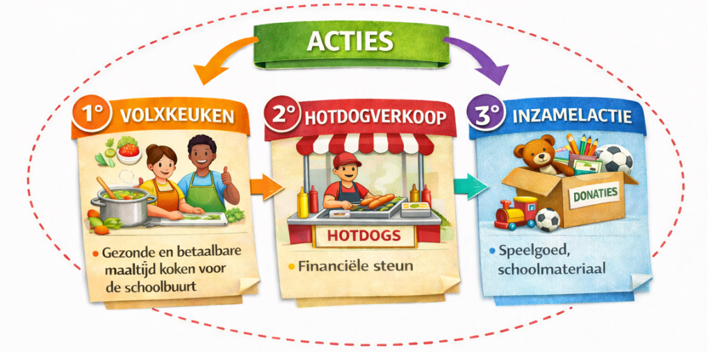 De leerlingen zetten acties op touw die verbindend werken naar de lokale gemeenschap van de schoolbuurt en de stad Sint-Niklaas.